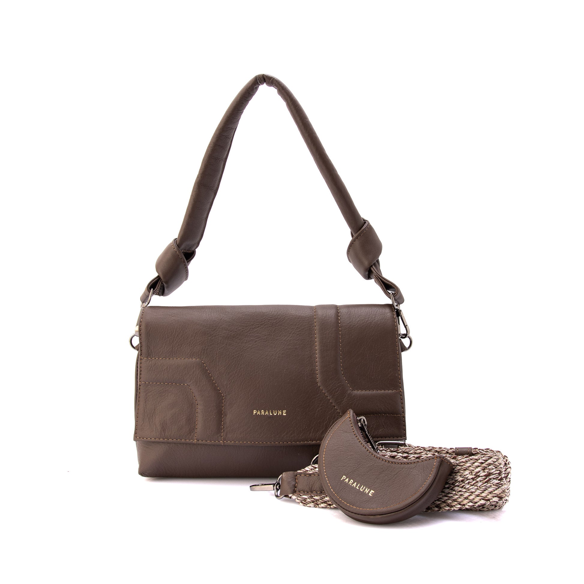 Hecha 100% de piel en color Chocolate con acabado natural, detalles abullonados, herrajes color negro y asas intercambiables para combinar con tu esencia.